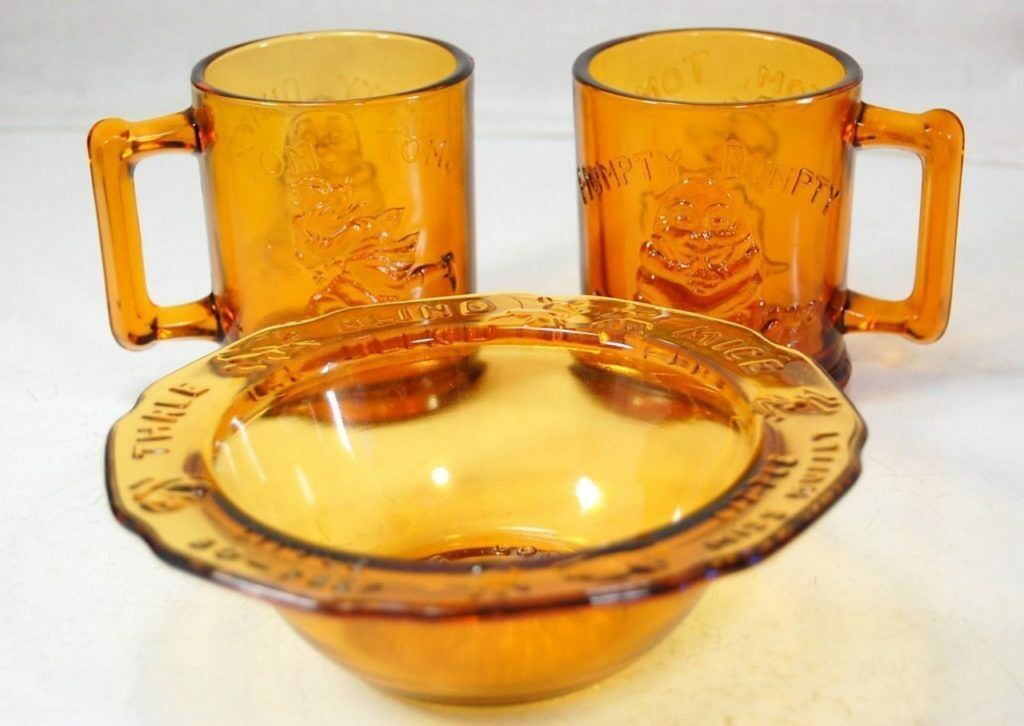 For your consideration is this lot of 3 pieces of amber child’s glass. I think that all of these pieces were made by Indiana Glass for Tiara in the pattern of Nursery Rhyme. All three have the same color amber. There are 2 Humpty Dumpty/Tom-Tom the Piper’s Son mugs that measure 3 1/2″ tall and 3″ in base diameter. The Mother Goose bowl measures 6 1/4″. All 3 pieces are in mint/unused condition with no cracks, chips, and no sign of use. Please see the pictures for more details.