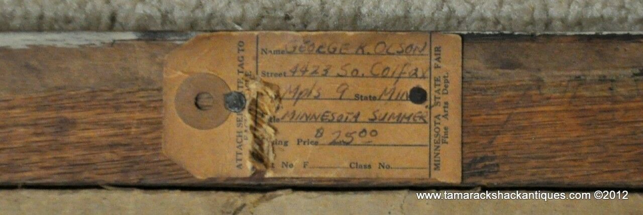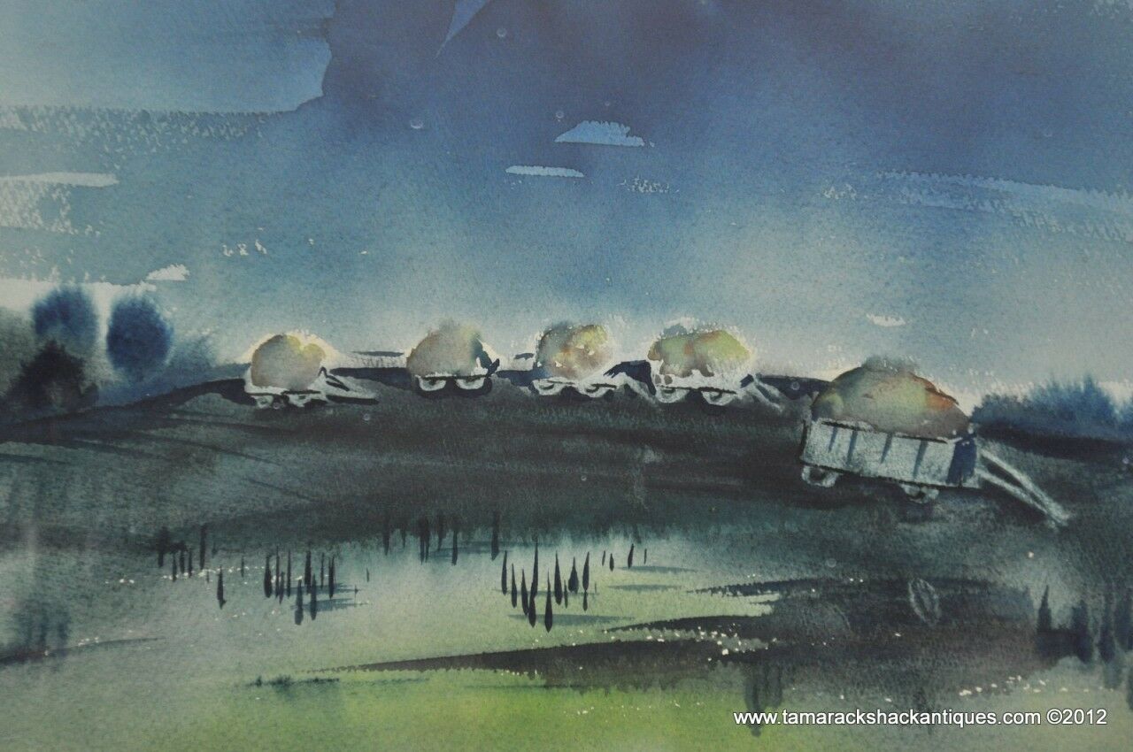 For your consideration is this Watercolor Painting of a Minnesota Summer. There are five full hay wagons in a field. There is a lot of blue-green color in this painting and is relatively dark compared to most watercolor paintings. The painting measures 16″ by 23″ and with the frame 28 1/2″ by 37 1/2″. There is a signature in the lower left-hand corner that reads G.K. Olson. There is white matting around the painting 3 3/4″ wide on top and bottom and 5″ wide on the sides, and then the white painted wood frame. The wood frame is in great condition but the white paint seems to be fading and on the back it has some wear. Also, there is what looks to be foxing below the painting and in the upper right-hand corner on the white matting. There is a wire on the back of the frame that the painting can be hung from. Please see the pictures for more detail.