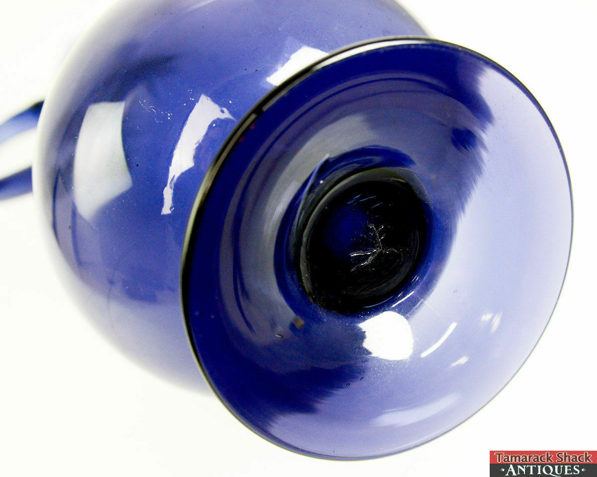 For your consideration is this vintage hand blown glass ewer. The ewer is in a midnight blue color and features a flared spout, a handle, a bulbous bottom, and a footed base. It has a ground pontil on the bottom. It measures 13 1/2″ tall by 6″ wide with a 4 1/2″ base. This ewer is in good condition with no cracks or chips, however, there is a manufacturer 1 1/2″ scratch on the underside of the handle. There is also a small scratch near the lip and a long light scratch on the inside of the back of the vase. Please see the pictures for more detail.